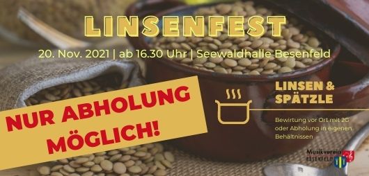 Das ursprünglich auf Samstag, 20. November geplante Linsenfest können wir in dieser Form leider nicht ausrichten. Die aktuelle Corona-Lage zwingt uns, die Festlichkeiten zu reduzieren und auf einen reinen Straßenverkauf abzuändern. Die Gesundheit aller Menschen geht vor und wir wollen unseren Beitrag zu Risikominimierung neuerlich leisten. Der Straßenverkauf von Linsen mit Spätzle findet von 16:30 Uhr – 20 Uhr statt. Es wird auch Kinderportionen geben.